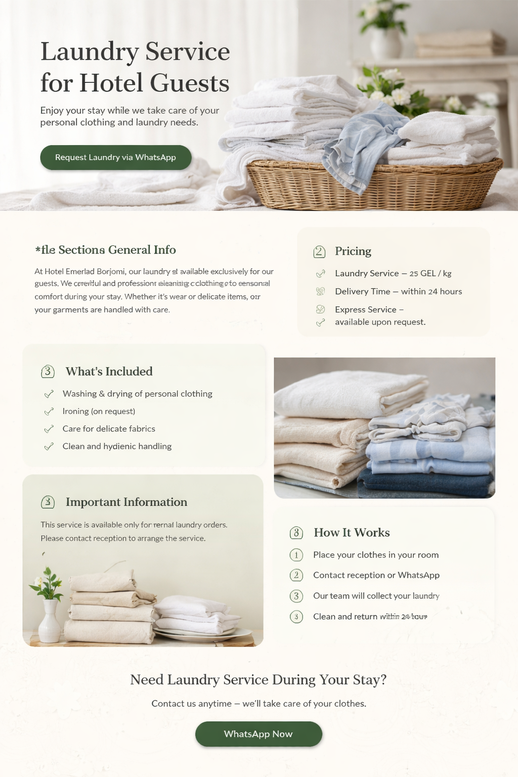 At Hotel Emerald Borjomi, our laundry service is available exclusively for our guests.